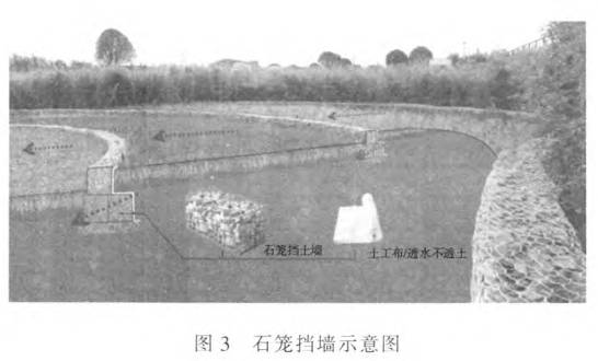 為了充分發(fā)揮"海綿體"的特性,園區(qū)路面及停車(chē) 場(chǎng)釆用高分子納米合金材料和四維蜂巢約束系統(tǒng)(見(jiàn)圖2),該系統(tǒng)具有使用壽命長(zhǎng)、施工周期短、維護(hù)成本低、便于雨水下滲、可減少水土流失等優(yōu)點(diǎn)。同時(shí)在進(jìn) 行園區(qū)建設(shè)時(shí)還將石料填入柔性鋼絲籠中達(dá)到一定 的孔隙率,逐層砌筑成柔性擋土構(gòu)筑物,從而形成石 籠擋墻(見(jiàn)圖3),保證水土自然交換,防止水土流失, 保證園區(qū)排水安全。