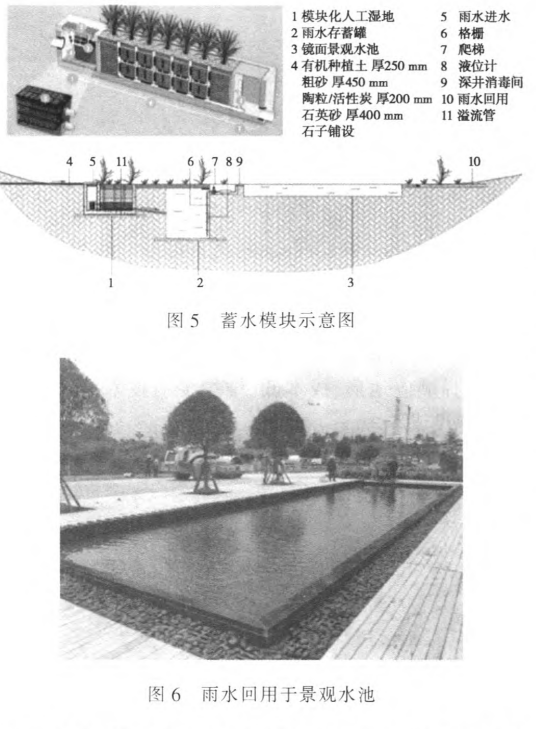 貴安新區(qū)多年平均降雨量約為1106mm,而創(chuàng)新 園總建設(shè)用地面積為6.9hm2,則園區(qū)內(nèi)年均降雨總量 約為7.6萬(wàn)m3,下沉式綠地、蓄水模塊等積蓄的雨水可 用于園區(qū)的綠化、道路澆灑等,緩解再生水的用水壓力。蓄水模塊示意圖如圖5所示;雨水回用于景觀水池 如圖6所示。