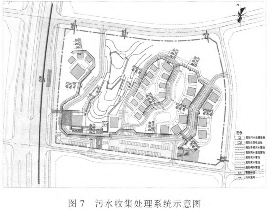 在園區(qū)東南角設(shè)置污水資源化中心1座,設(shè)置灰 水、黃水和褐水3套污水處理工藝,其中灰水處理設(shè)施 按再生水標(biāo)準(zhǔn)設(shè)計(jì),資源化中心總占地面積約780m2。并設(shè)置灰水、黃水、褐水3套負(fù)壓排水管道,將污水分類收集并輸送至資源中心,如圖7所示。